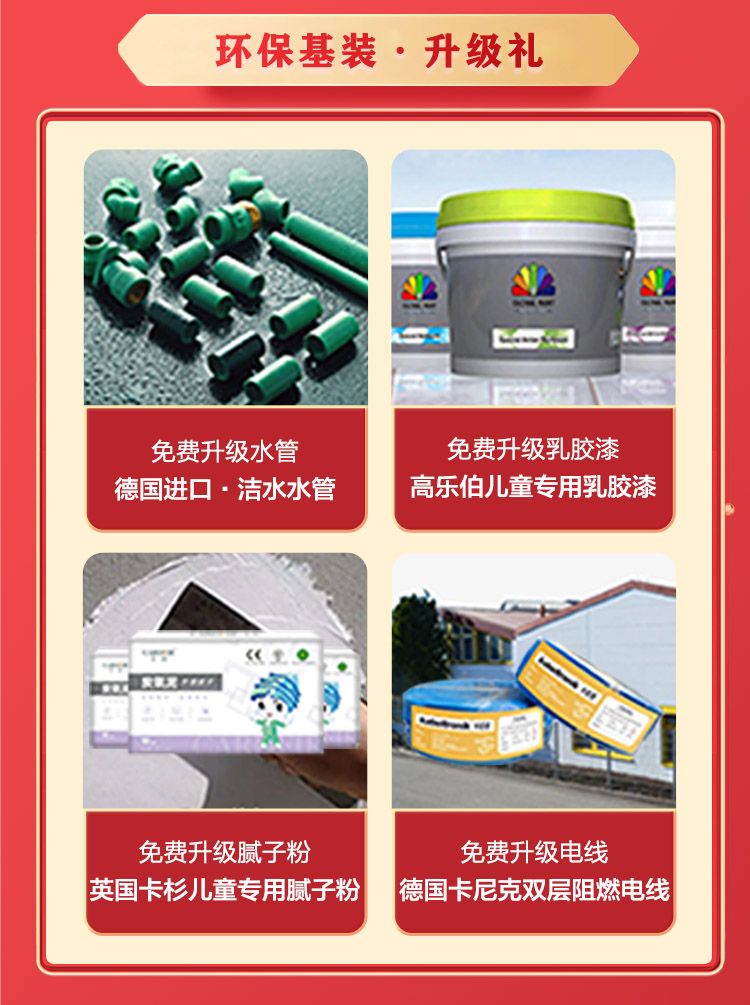 為確保每一位客戶都能享受到高品質(zhì)的裝修體驗(yàn),我們將免費(fèi)升級(jí)環(huán)保基裝。包括但不限于材料升級(jí)不加價(jià)、、隱蔽工程終身質(zhì)保等實(shí)惠措施,免費(fèi)升級(jí)為德國(guó)進(jìn)口潔水水管,免費(fèi)升級(jí)為高樂伯環(huán)保乳膠漆,免費(fèi)升級(jí)為兒童膩?zhàn)臃?,免費(fèi)升級(jí)進(jìn)口阻燃電線。讓您在享受優(yōu)惠的同時(shí),更能安心無憂地迎接新家的誕生。